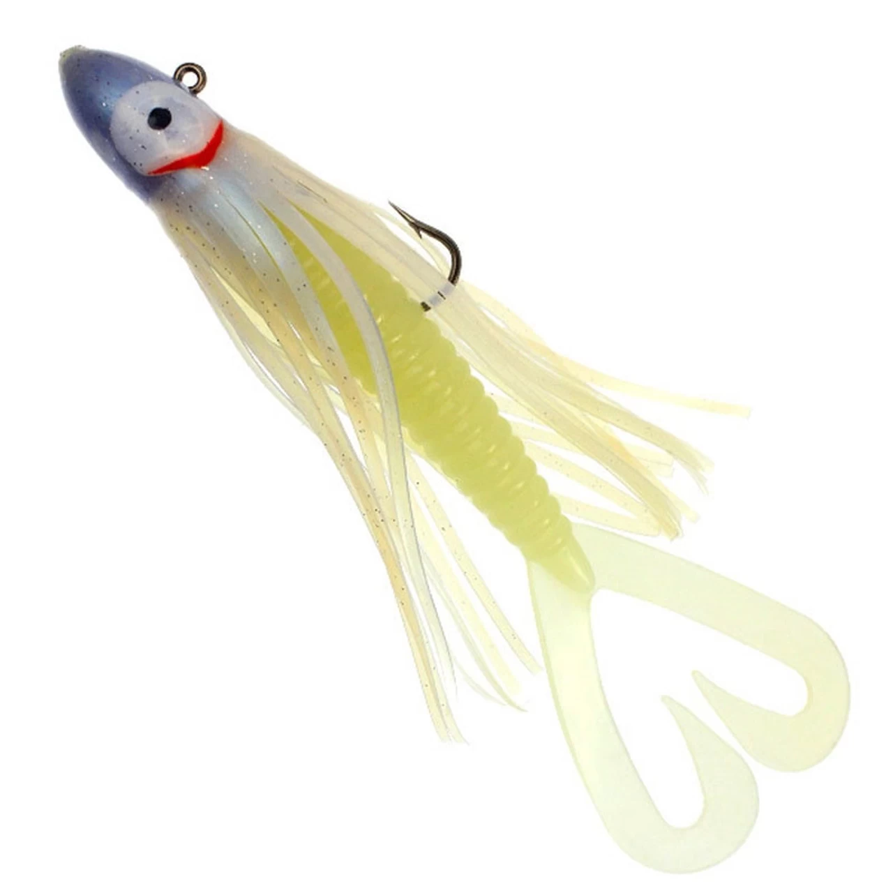 Pitbull constructed the jig head using a super sharp, super strong black-nickel hook that is certain to handle the meanest of predatory fish. A UV-enhanced hoochie was custom designed to cover the lead jighead, offering incredible life-like action to the lure and an ultra-realistic profile underwater. To see the advantage of UV and Glow Enhancement click here. Behind the head extends a UV-enhanced scampi-style twin tail grub which gives the Killer its swimming action that has proven effective trip after trip. The twin tail grub in combination with the hoochie provides a unique combination of actions and movements in a lure which is rarely seen on the market today. The Pitbull Tackle Killer Jig has been tested all the way down the Pacific Coast and it has proven successful on Halibut, Ling Cod and Rockfish, Seabass, Grouper, and countless other species. One of the great things about this bait is when it sinks down to the depths, you never know what might pull back.